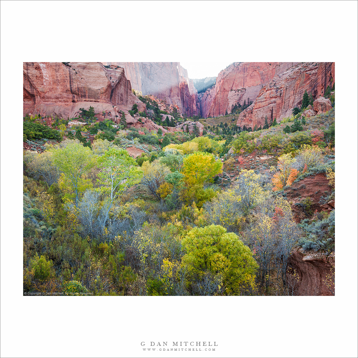 We arrived on a very cold early autumn morning when many trees and bushes were just beginning the fall color changes. In most places things were still very green, but here and there it was possible to find some nice displays of color. Near the location of this photograph the road made a sort of horseshoe bend across the lower portion of the canyon, and I spotted a lot of things that seemed to be photo-worthy to me: the early morning sun light beams slanting through morning haze across the upper section of the canyon, the dry waterfall at its furthest-back point, the always-beautiful red rock cliffs, and the colorful foliage beginning to appear in the canyon.