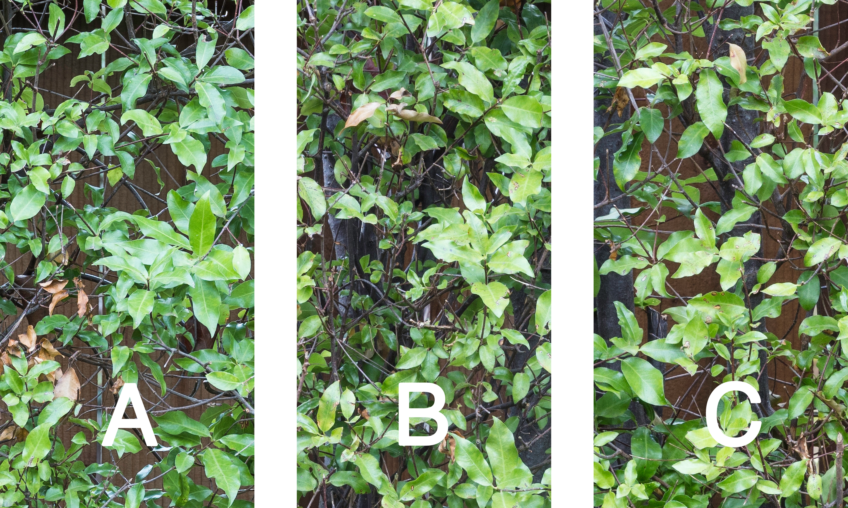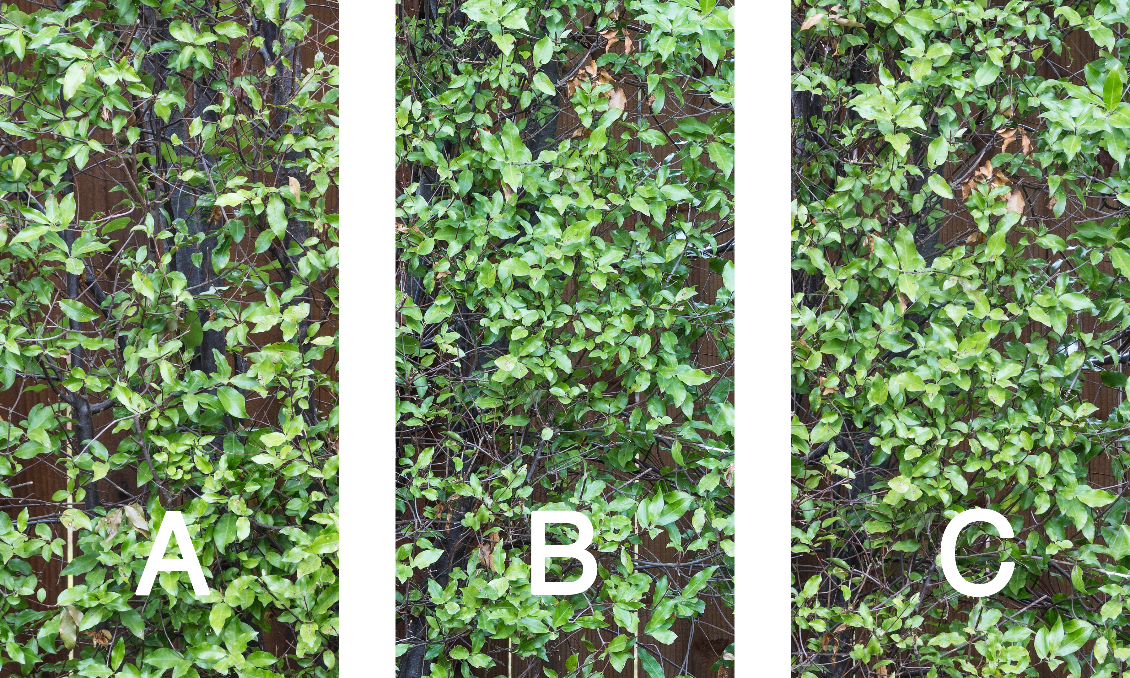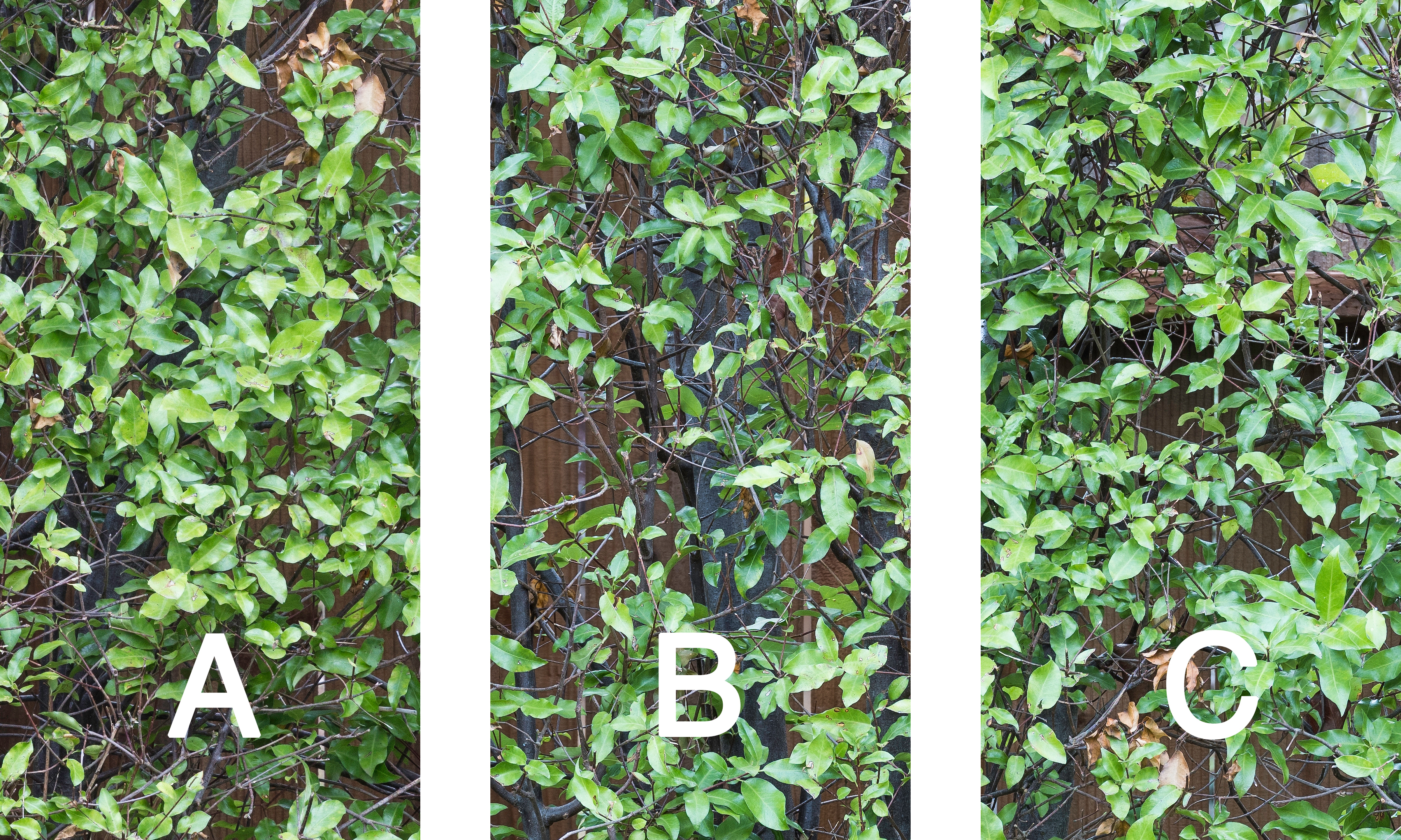 With that in mind, I have prepared some files that may be useful for comparing print resolution from Fujifilm GFX 50S and the Canon 5DsR. These files each hold three “test strips” labeled A, B, and C. The files have been formatted for producing prints with a print area of 10″ wide and 6″ tall (use letter-size paper) when printed at a resolution of 360. They are sRGB color files in the highest quality (Photoshop: 12) jpg format.
