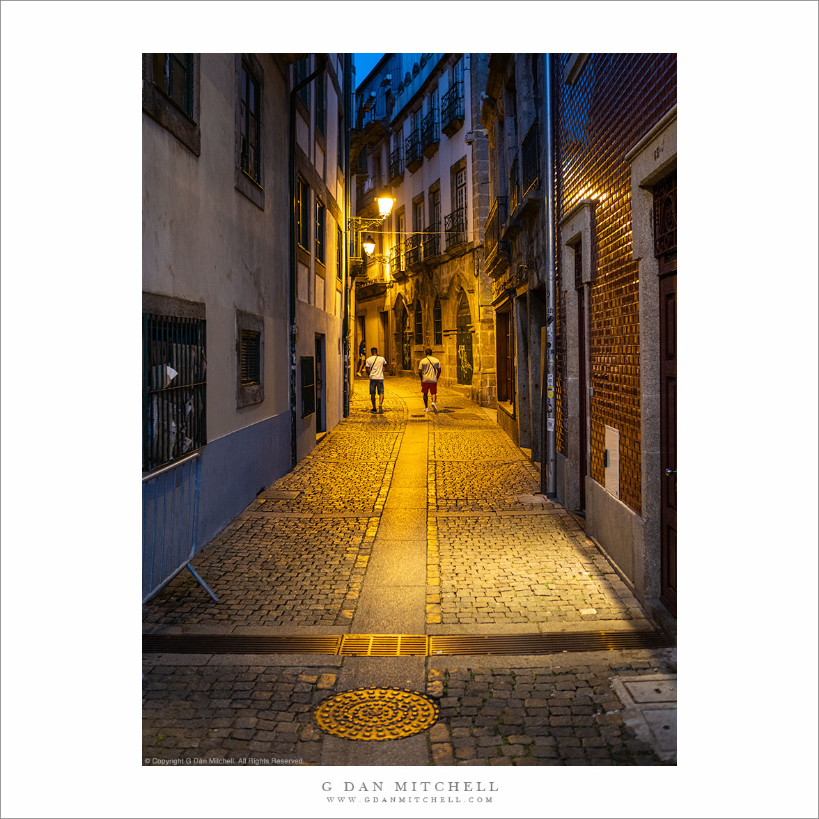 I made the photograph a few nights later as we headed back to our hotel from a long walk to the other side of the Douro River and back. We crossed back over the river after sunset, and our route took us past this side street again. This time I thought the night scene looked fascinating, so I paused and photographed down the deserted street.